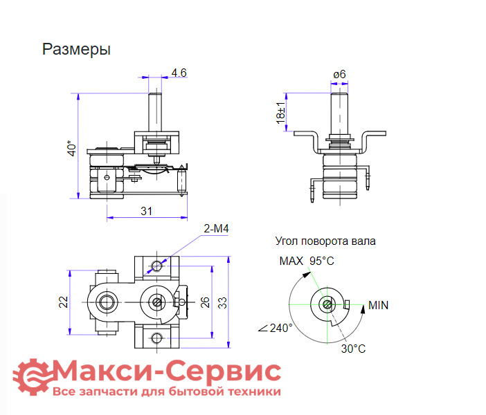 Температура размыкания контакта при максимальном угле поворота вала 240°: